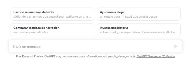 El primer paso es acceder a una plataforma que ofrezca acceso a ChatGPT. Puede ser un sitio web específico o una aplicación, dependiendo de dónde esté disponible. Puedes probar en la página del propio ChatGPT. Alli encontrarás, una vez te hayas registrado, una interface muy simple; a la izquierda, el panel donde navegar por tus anteriores conversaciones con la IA y a la derecha un cuadro como el que os dejo en la imagen, donde tendréis que introducir vuestra consulta. Tras unos instantes chatGPT generará la respuesta y os la mostrará en pantalla.